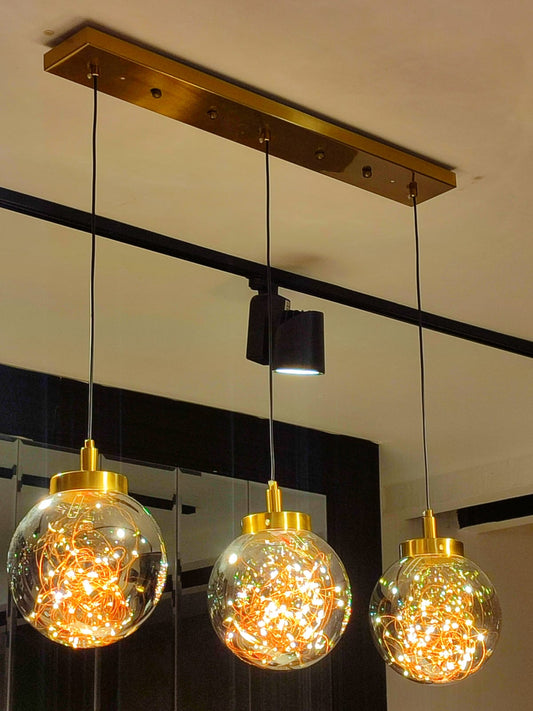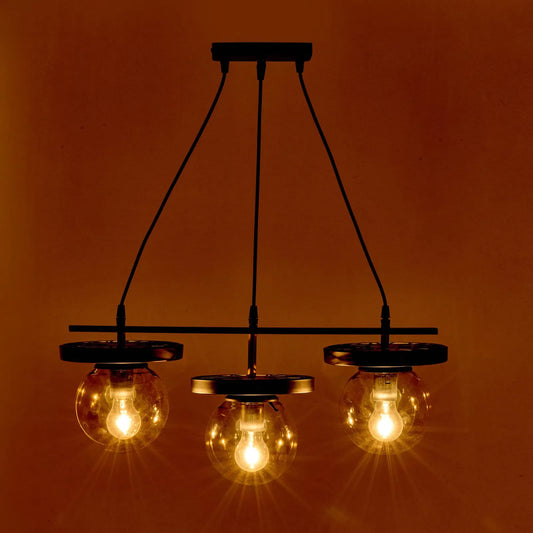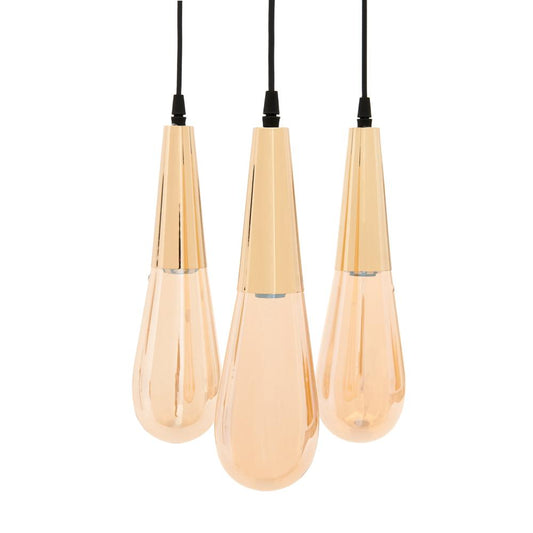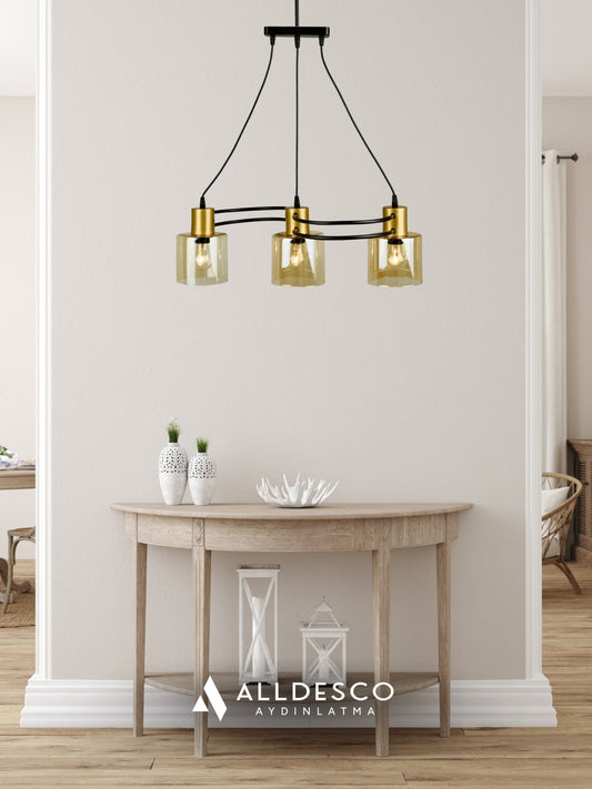 Verona 3’lü Cam Avize – Dekoratif Bal Rengi Silindir Cam, Gold Detaylı, CE Belgeli