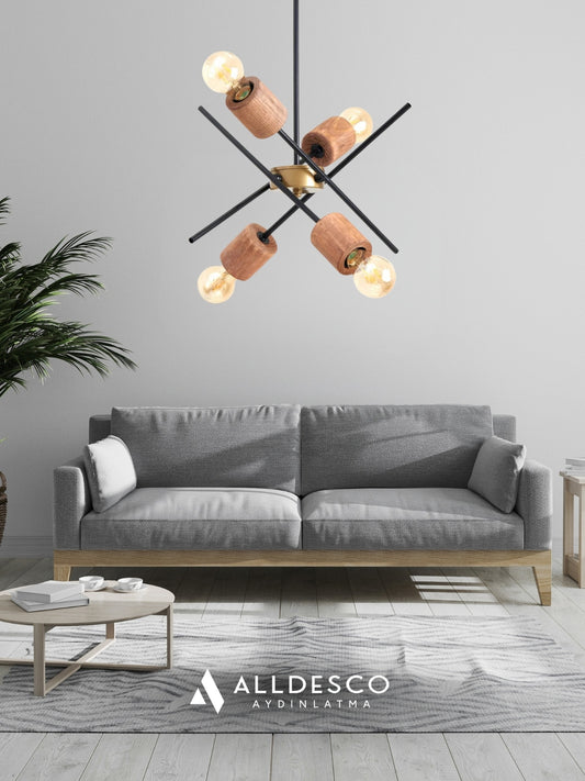 Astrex Rustik Salon Avizesi – 4 Başlıklı, Ahşap Detaylı Endüstriyel Lamba