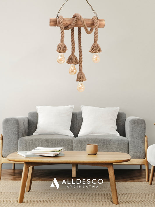 Cordela 4’lü Rustik Halatlı Ahşap Avize – Zincir Askılı, Otantik & Dekoratif Tasarım