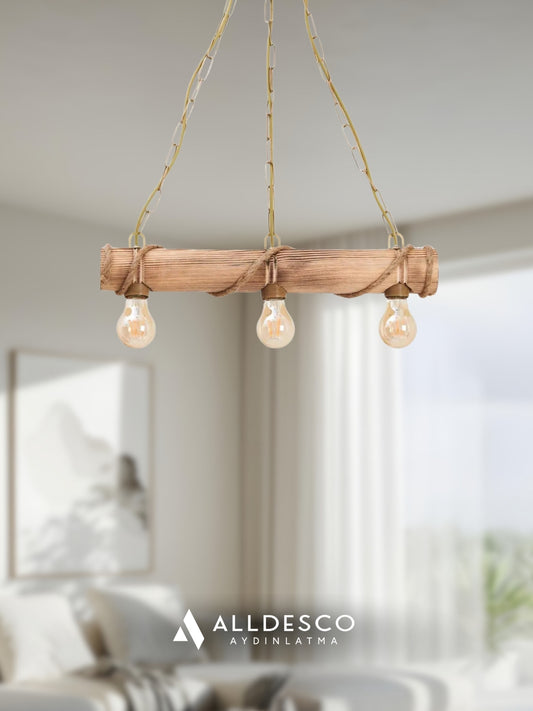 Corda Rustik Çiftlik Tarzı 3'lü Avize – Halat Sargılı Ahşap Gövde, Zincir Askılı