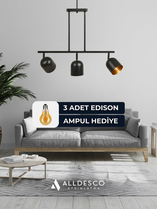 Noir 3’lü Modern Avize – Siyah Gövde, İçi Gold Başlık, Salon ve Mutfak Uyumlu Tavan Lambası