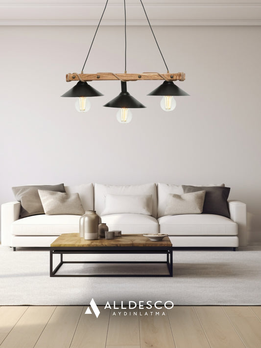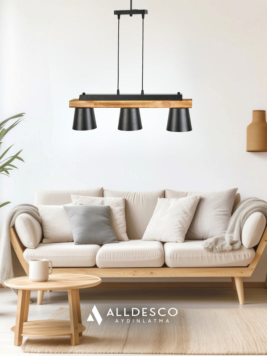 Nordex 3’lü Ahşap Sarkıt Avize – Siyah Metal Gövde, Gümüş Başlık İçi, Ayarlanabilir Aydınlatma