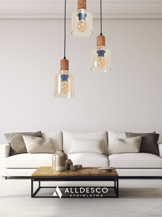 Sienna 3’lü Cam Sarkıt Avize – Ahşap ve Gold Detay, Ayarlanabilir uzunluk, Siyah Tavan Tepsili
