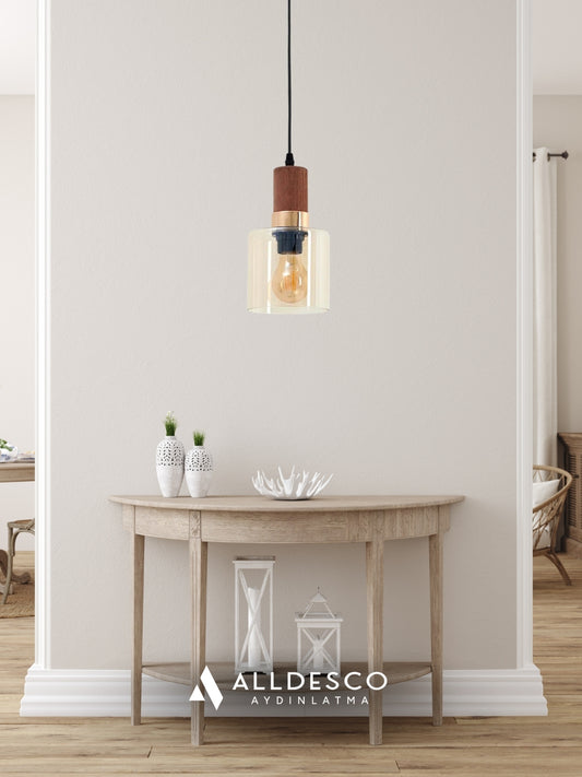 Sienna Tekli Cam Sarkıt Avize – Modern Tasarım, Ahşap ve Gold Detaylı, Ayarlanabilir Uzunluk