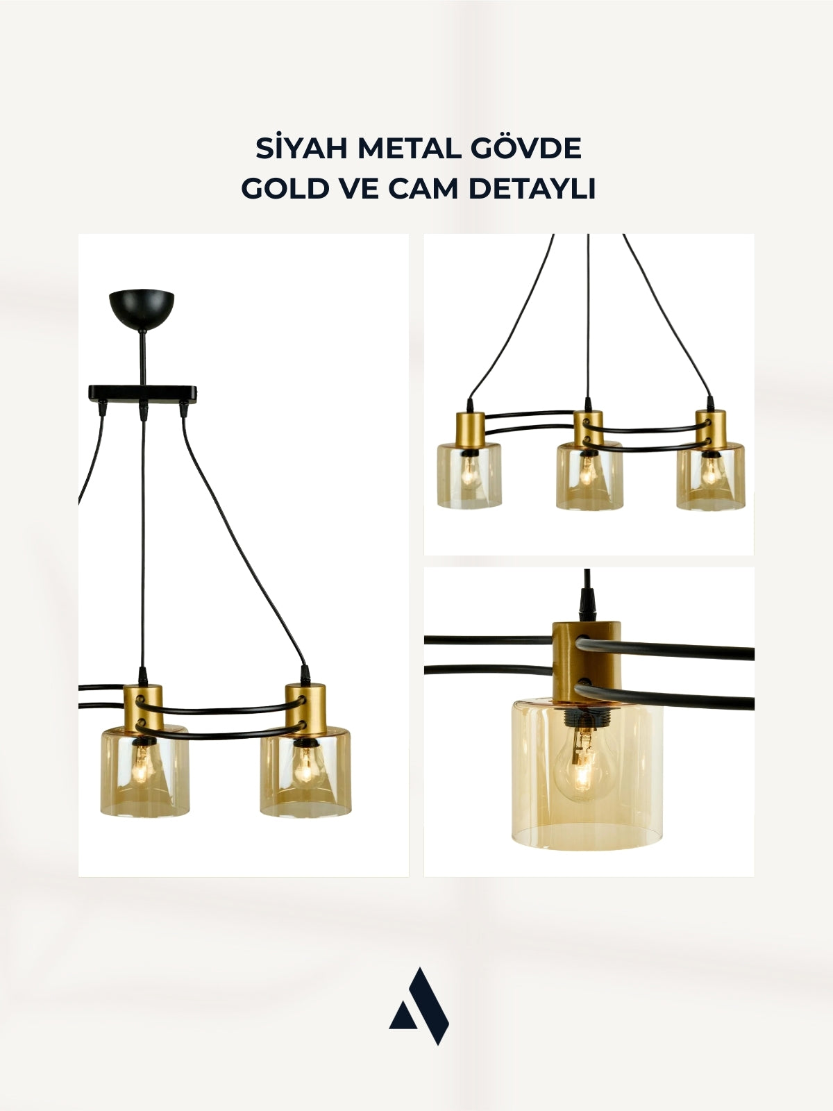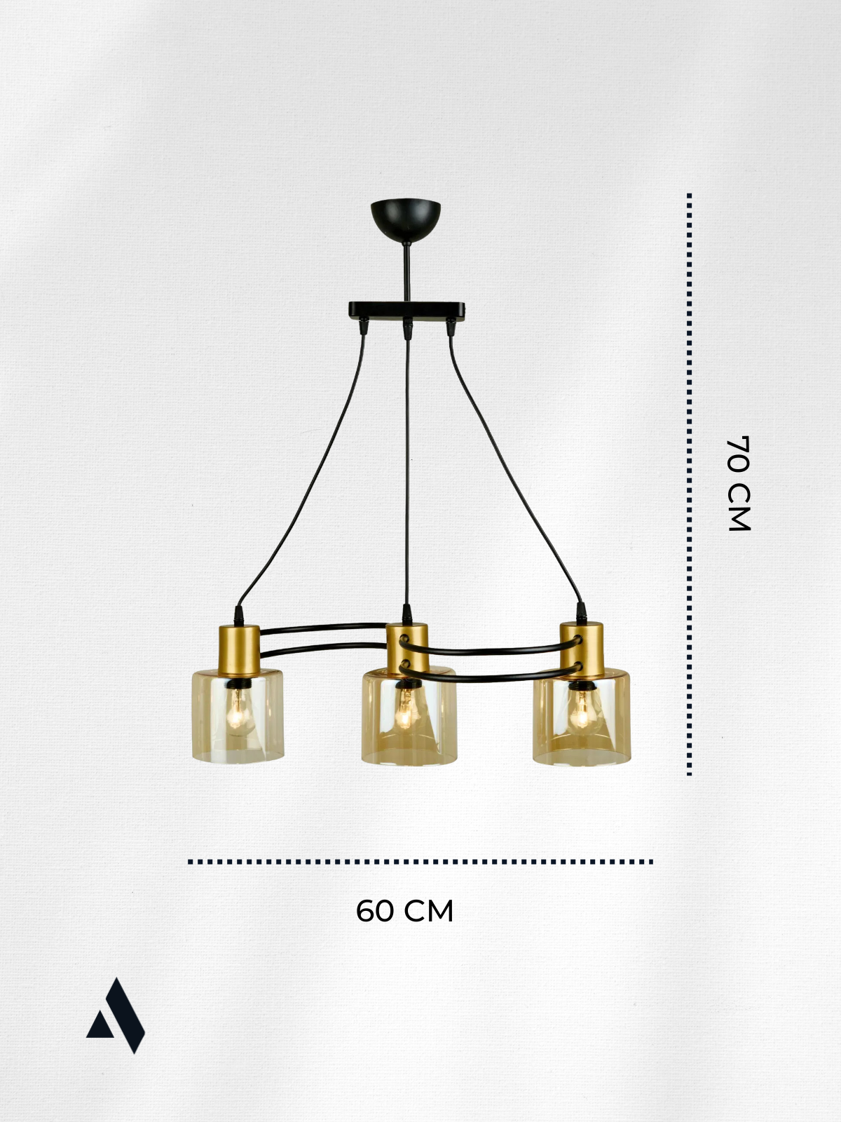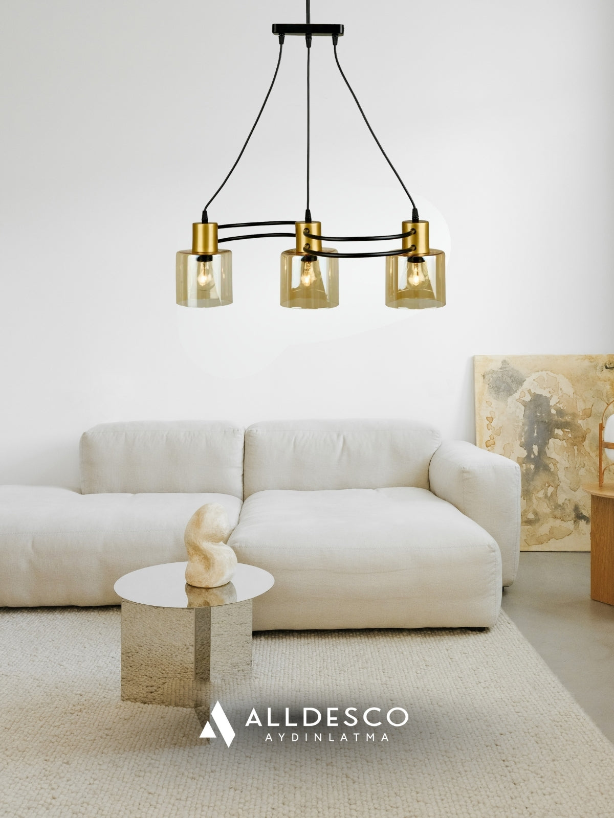 Alldesco Verona 3’lü Cam Avize – Dekoratif Bal Rengi Cam, Gold Detaylı, CE Belgeli