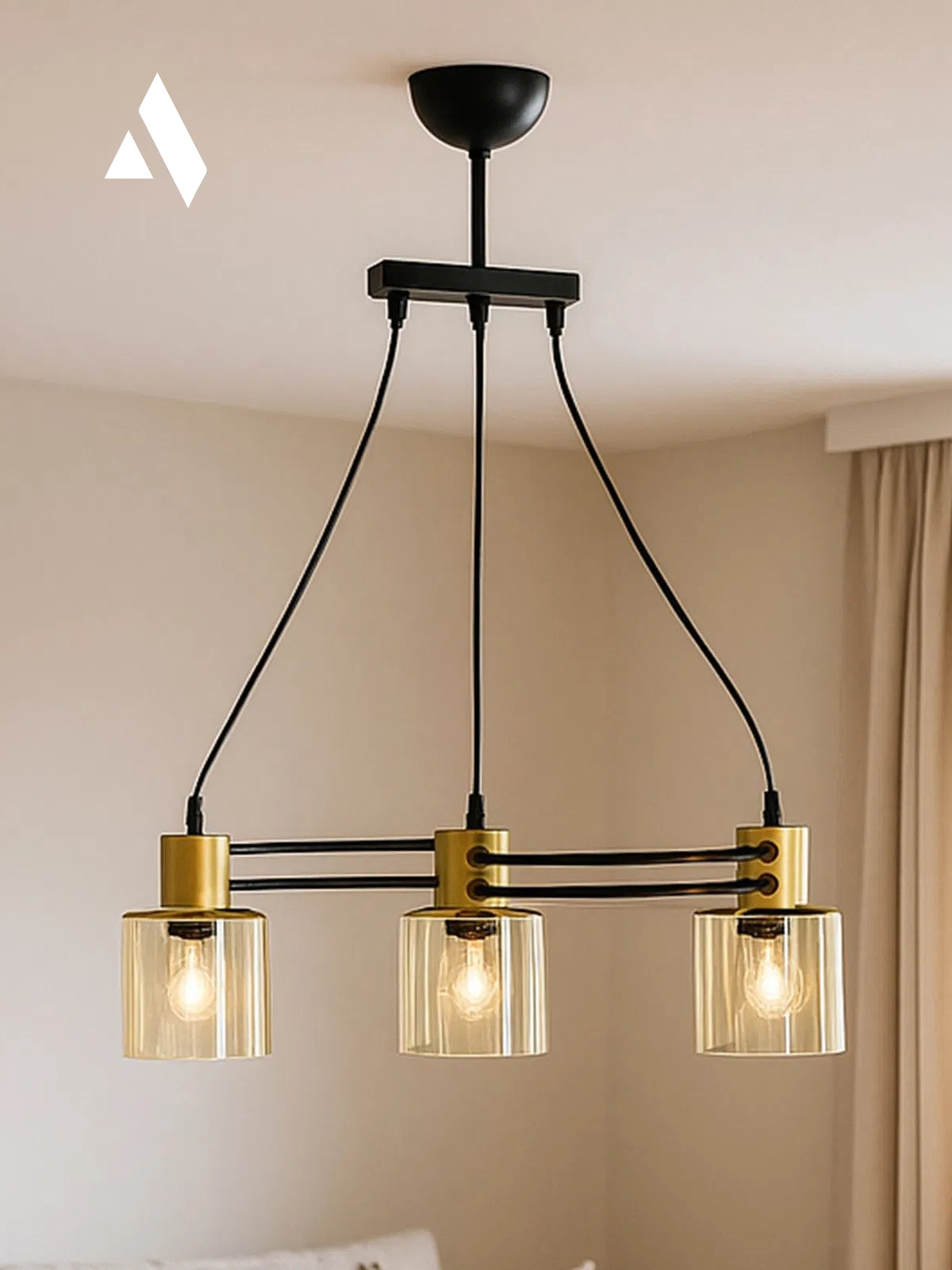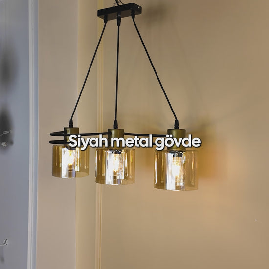 Verona 3’lü Cam Avize – Dekoratif Bal Rengi Silindir Cam, Gold Detaylı, CE Belgeli